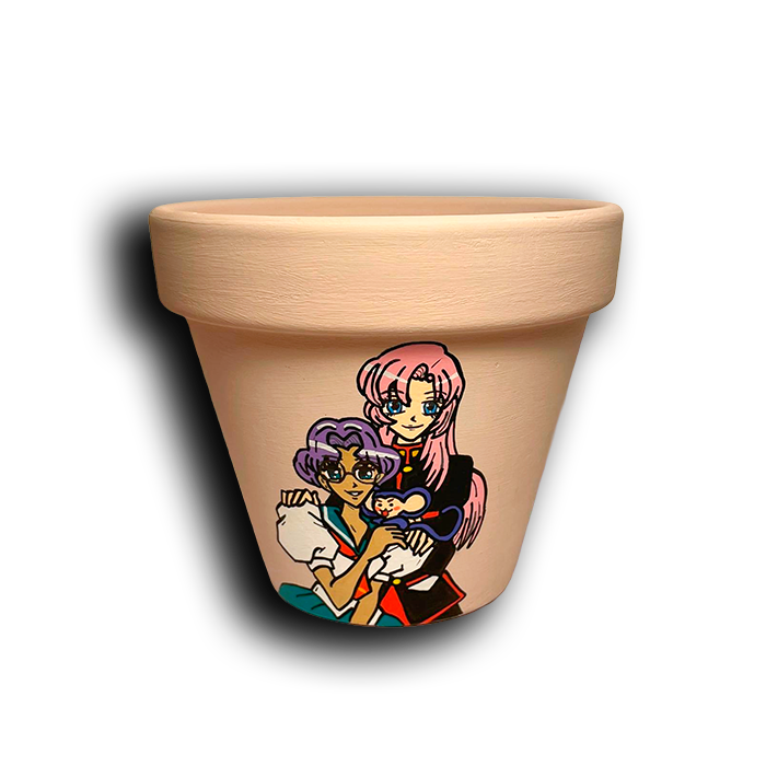 ¿Preparado para revolucionar hasta tus plantas? 🌹✨ Esta maceta pintada a mano está inspirada en la icónica serie Revolutionary Girl Utena, donde amistad, magia y duelos de espadas se entrelazan con estilo y mucho color.